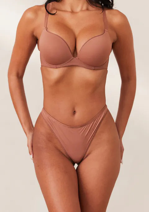 $30.00$30.00/A smooth beige demi bra with push up, molded cups, and contrast trim detailing.