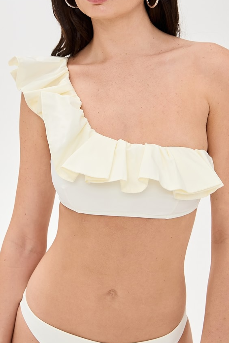 Ruffle bikini top is a one shoulder top with Single ruffle details.  Ruffle bikini bottom is a low-cut bottom with a higher waistband . It has...