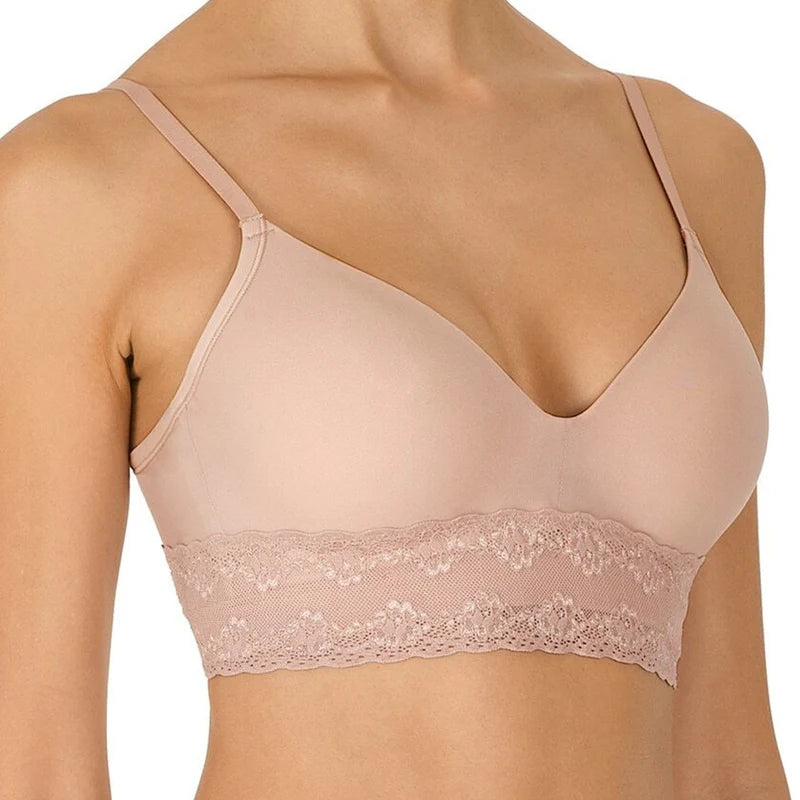 Wide flat elastic is hidden at the bottom band for support without wires. Clean finished sweetheart neckline disappears under clothing. 4-row hook & eyes for added adjust-ability. Built-up ballet back for smoothing comfort.