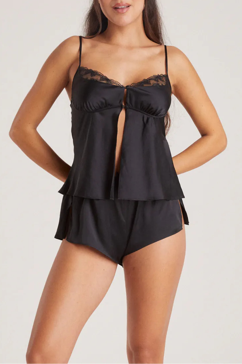 This Bow Satin cami pyjama set feature with Satin, cami-style pyjama top,Bow-inspired embroidery along neckline,Satin-covered buttons to front,Satin underbust channel with gathered cups for light shaping,Laces May ve Vary Than The Actual Image