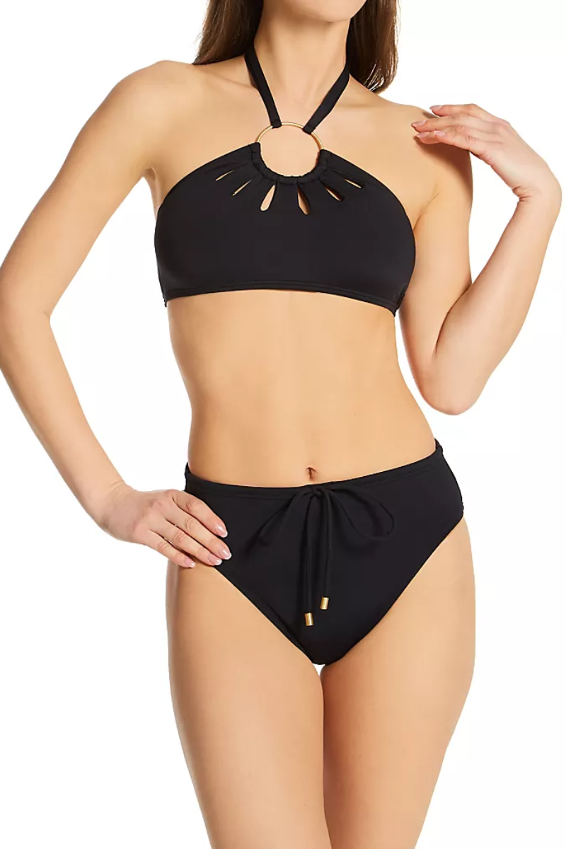All eyes will be on you as you strut around in this halter swim Bikini Set. Large ring creates cut-outs for a chic look. Made of nylon, polyester, and spandex.The Serengeti Shades Logo Ring Halter Bikini Set lets you prance around the pool in style with this wire-free swim top and bottom.